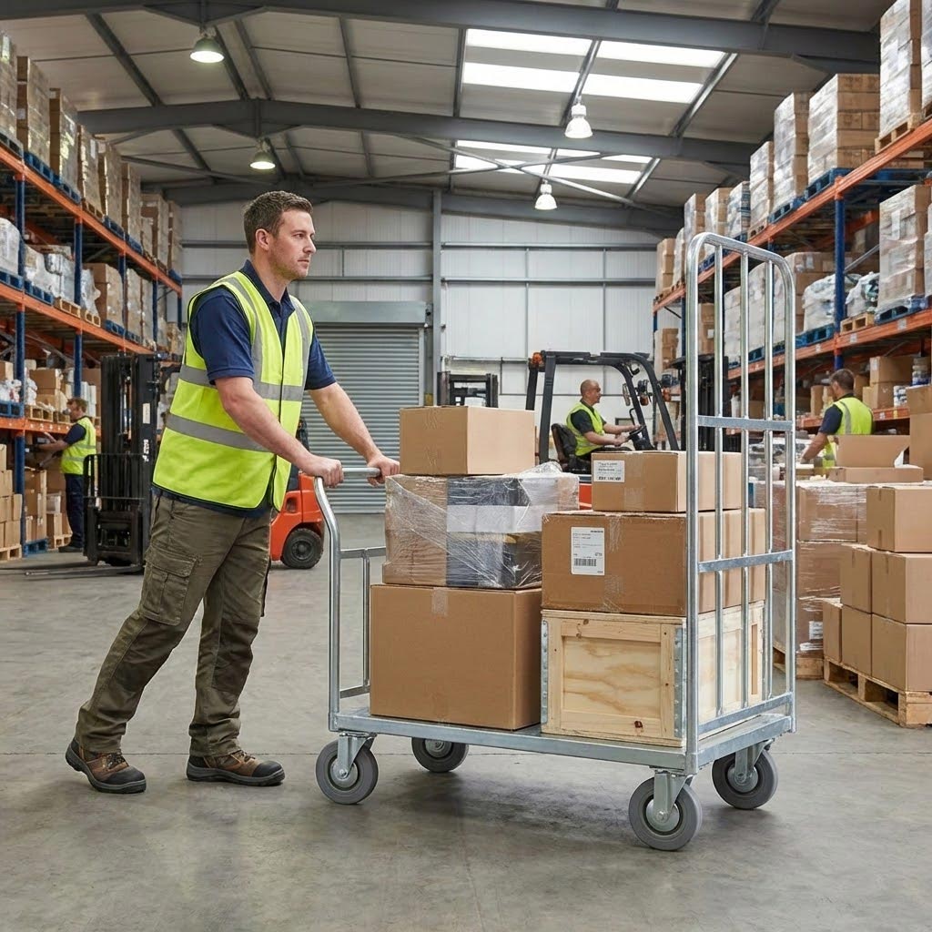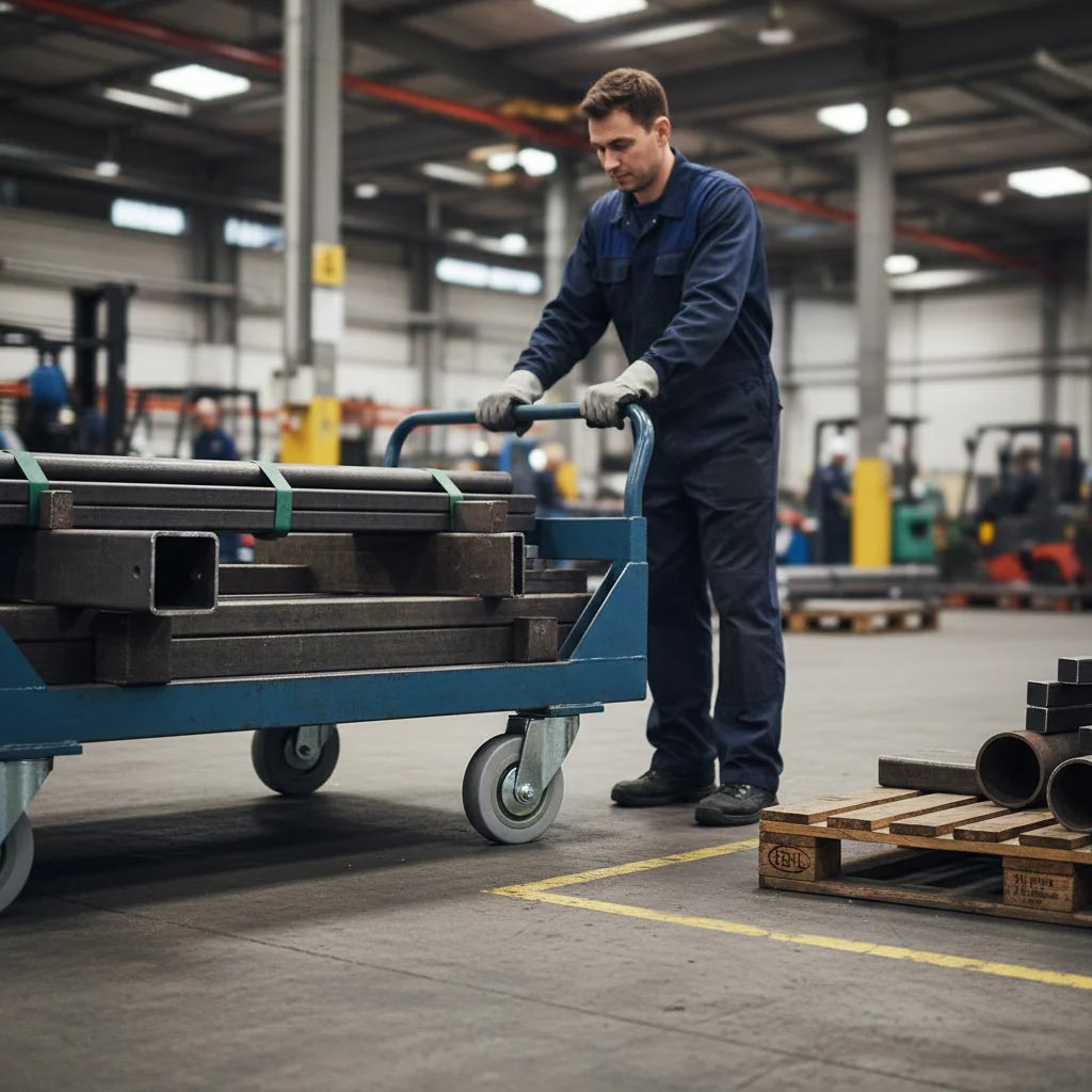 Tool carts, material handling trolleys, and mobile workbenches in workshops and factories